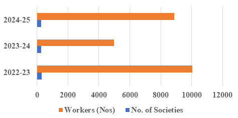 Key Insights are Profit shows extremely high variation (std = very high) due to the massive jump in 2024–25. Turnover steadily increases (mean ˜ 1390 crores). Wages steadily decline (mean ˜ 255 crores). Profit exhibits high variability due to the massive increase in 2024–25. Turnover shows consistent upward growth. Figure 2 gives Physical Performance of Industrial Cooperative Societies like No. of workers and no. of societies.